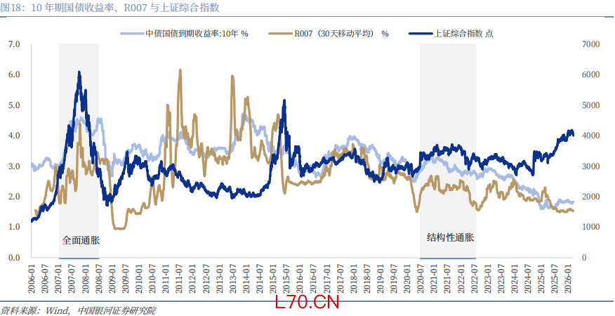 原油价格大幅上涨引发市场开始讨论其价格上涨是否会改变中国的通胀水平,进而带来人民银行收紧流动性,并对资产价格产生影响?我们回顾了历史上两个典型的因油价上涨推升中国通胀水平的历史时期,分别为2007年-2008年、2021年-2022年。其中2007年-2008年表现为全面通胀,央行采取收紧流动性,上调银行存款准备金率和加息。而2021年-2022年则表现为结构性通胀,央行并未采用紧缩的货币政策而是保持稳健的基调,采用降准、调降LPR,并积极使用结构性货币政策工具支持绿色能源,缓解能源缺口、能源保供等。我们认为房地产下行周期叠加供强需弱的格局之下,本轮高油价可能带来的通胀上行压力将表现为结构性通胀,难以形成全面通胀。央行的货币政策调控框架为:1、以我为主;2、密切关注PPI向CPI的传导;3、保持汇率弹性以缓解外部冲击。央行将不会采取紧缩货币的方式加以应对,而是保持流动性充裕,年内降息降准的空间仍存,同时有望创设或优化结构性货币政策工具以支持绿色能源,缓解能源缺口、能源保供等。