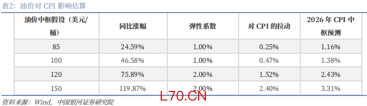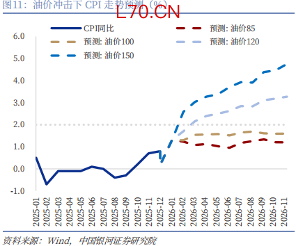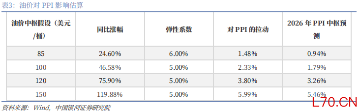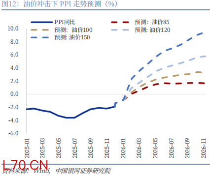 假设今年油价全年中枢在85、100、120、150美元,对应的CPI分别1.16%、1.38%、2.43%、3.31%。其中,油价中枢在120美元以内的话,对CPI拉动作用有限;但一旦油价中枢超预期上行至120美元的话,CPI则可能在4月份突破2%,全年中枢也超过2%。同样地,我们使用油价全年中枢在85、100、120、150美元,测算对应的PPI别0.94%、1.79%、3.26%、5.46%。整体来看,国际油价在 120 美元 / 桶以下区间运行时,我国面临的输入型通胀压力相对有限;但若美伊局势持续升级并推高油价至极端水平且难以回落,国内或将面临一定的输入性通胀风险。