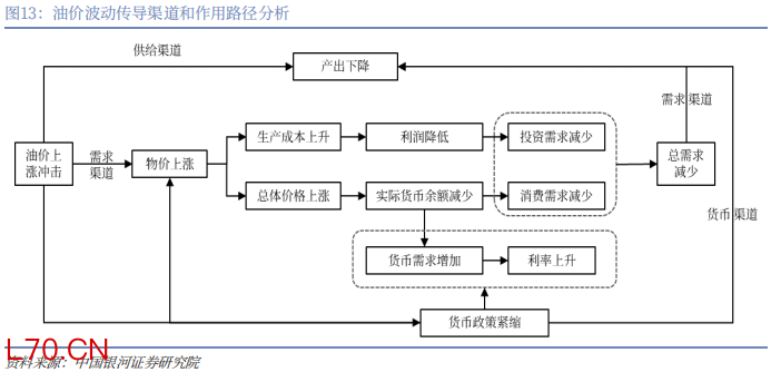 一是总供给冲击。石油位于产业链上端,油价上升导致以其为投入原料的企业生产成本增加、产量降低,如石油化工、交通运输、制造业等以石油为燃料或以石油为化工原料的相关行业,从而使得社会总供给减少,潜在产出下降。油价上升引起的生产成本上升,还会引发能源密集型企业进行结构调整,在资本和劳动力市场存在摩擦的情况下,结构调整会导致的劳动力供需不匹配、引起结构性失业,影响产出。