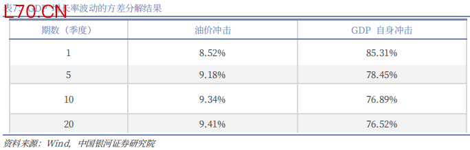 进一步通过方差分解量化油价冲击对GDP波动的贡献度,本文对2008-2025年样本进行方差分解,考察不同冲击源对GDP增长率波动的贡献度。方差分解结果显示:GDP自身冲击是其波动的最主要来源,贡献度长期稳定在75%以上;油价冲击对GDP波动的贡献度在第1期为8.52%,随后逐步上升至第20期的9.41%,结果如表7所示: