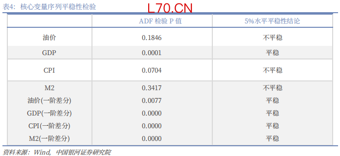 本文所有数据均来源于Wind数据库、国家统计局官方发布数据与美国能源信息署(EIA)原油数据库。为避免伪回归问题,本文采用ADF单位根检验对变量的平稳性进行检验,检验形式根据变量特征选择含截距项或含趋势项与截距项,滞后阶数根据AIC准则自动选择,检验结果如表4所示
