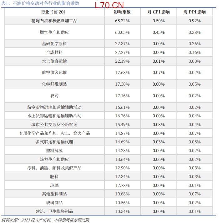 我们还通过投入产出表(2023)计算原油对国内通胀的影响。对于CPI而言,通过投入产出模型并以各部门产出用于居民消费占总消费比为权重,使用2023年投入产出表对油价对CPI的影响进行测算,结论发现油价上涨100%将带动CPI上涨3.28%,其中精炼石油加工、燃气生产供应两大核心行业价格上涨对CPI贡献位居前二,合计贡献0.95%。同样地,通过投入产出模型并以各部门总产出占比为权重,测算油价对PPI的影响,结果显示油价上涨100%将带动PPI上涨5.93%。