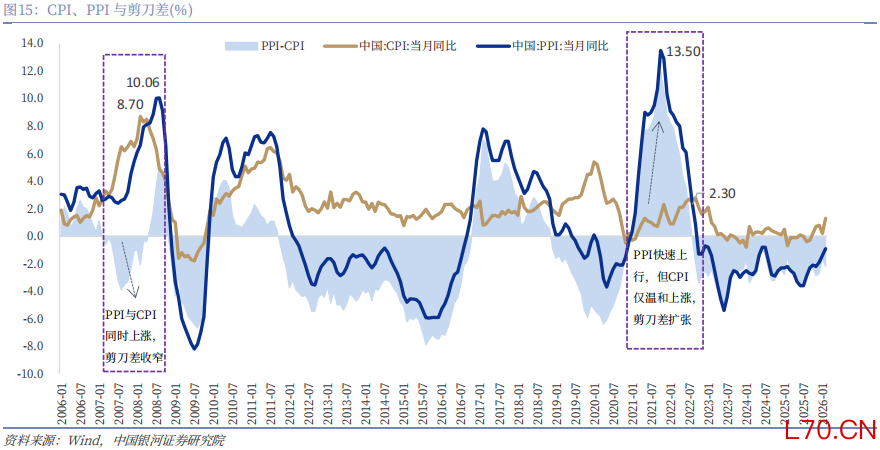 两轮因高油价带来的输入型通胀:分别是2007年-2008年和2021-2022年。2007年-2008年呈现的是全面通胀。原油价格从50美元/桶冲至145美元/桶,CGPI各分项同比增速均呈现显著上升。PPI和CPI均呈现显著拉升,两者的剪刀差收窄; 2021-2022则呈现典型的结构性通胀,原油价格从-38美元/桶冲至124美元/桶,CGPI各分项同比增速出现分化,CGPI煤油电项的同比增速跟随原油价格快速上行,但CGPI消费品项的同比增速则在0值附近徘徊。PPI和CPI走势差异明显,PPI呈现显著拉升但CPI仅是温和回升,两者的剪刀差大幅走阔。