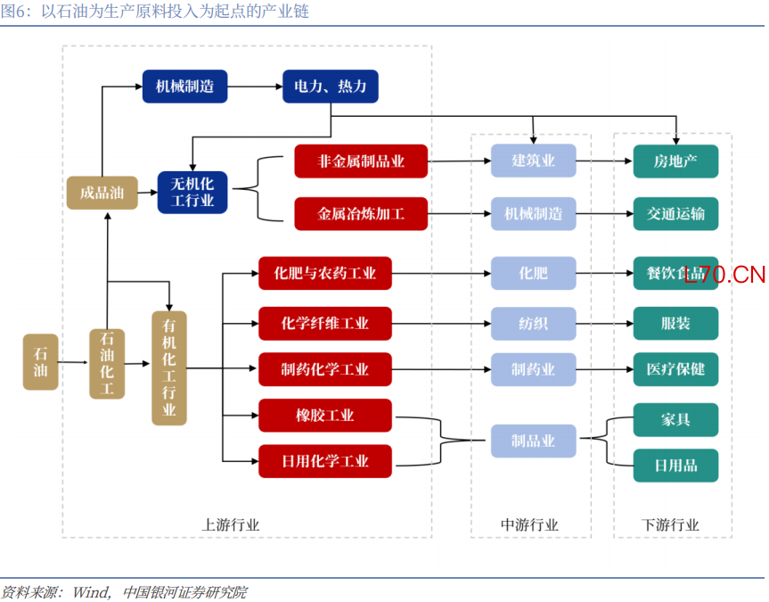 间接传导主要通过有机化工及中间品体系实现扩散。其传导逻辑为:国际原油价格变化传导至国内原油价格,并进一步影响烯烃类、苯类等有机化工原料价格,进而带动塑料、橡胶、化纤等工业中间品价格上行。这类中间品广泛应用于下游制造业,在进入塑料制品、橡胶制品、纺织服装以及各类加工制造环节后,成本压力逐步向终端产品传导,并体现在WPI以及相关行业的价格变化中,进一步影响PPI,并通过产业链传导至原材料购进价格与CPI,最终作用于GDP平减指数。与直接传导相比,这一路径具有链条更长、涉及环节更多、扩散范围更广的特征。由于中国拥有较为完整的工业体系,不同行业之间通过投入产出关系形成紧密联系,单一中间品价格上涨往往会在多个行业之间交叉传导,呈现出一定的“放大效应”,原本集中于上游能源与化工领域的冲击逐步扩散至更广泛的制造业和消费品领域。