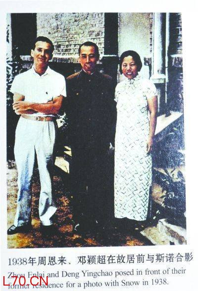 周恩来、邓颖超在珞珈山旧居前与斯诺合影。 资料图片