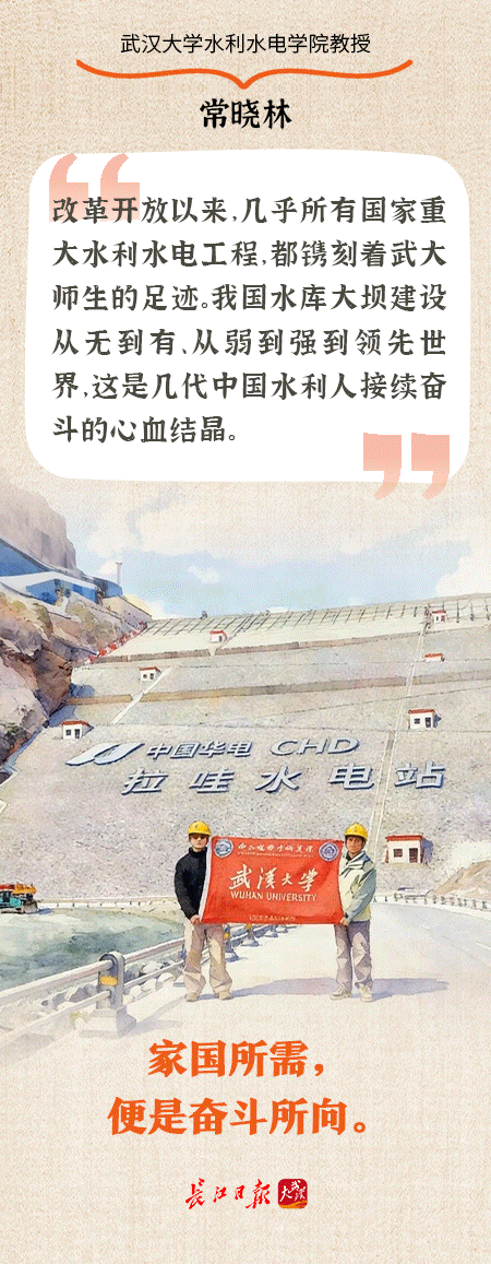 常晓林告诉记者,自20世纪50年代起,武汉大学水利水电学院便锚定国家水利建设需求,围绕丹江口水利工程、荆江防洪工程、葛洲坝与三峡水利枢纽、南水北调工程等国之重器,在高坝结构安全、流域洪水预报、河湖水沙关系、跨流域调度、节水灌溉等关键核心领域持续深耕、久久为功。师生们深度参与工程勘察、设计、建设与运维全过程,以扎实专业能力为大国重器平稳运行筑牢安全屏障,“要矢志不渝把论文写在祖国大地上,把身影留在沸腾的水电工地上,把名字刻在一座座雄伟的大坝上。”