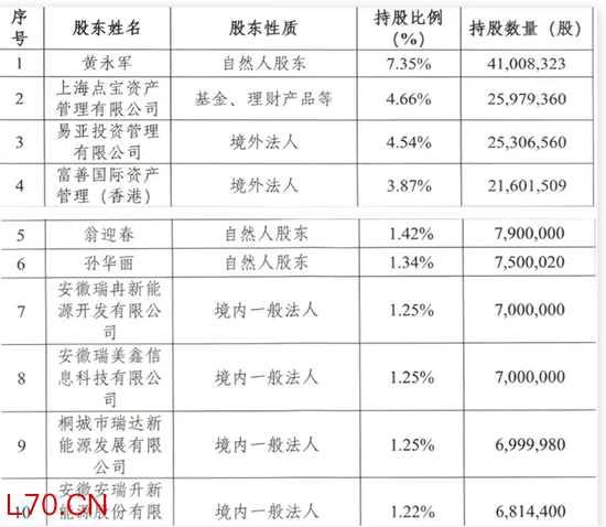 其中,持股权重居前的——上海点宝资产管理有限公司(简称:点宝资产)持股4.66%,易亚投资管理有限公司(简称:易亚投资)持股4.54%,安徽瑞冉新能源开发有限公司(简称:瑞冉新能源)、安徽瑞美鑫信息科技有限公司(简称:瑞美鑫信)、桐城市瑞达新能源发展有限公司(简称:瑞达新能源)三家直接位列前十大股东,均为安徽安瑞升新能源股份有限公司(简称:安瑞升)全资子公司,三者与母公司安瑞升合并计算持股4.97%。
